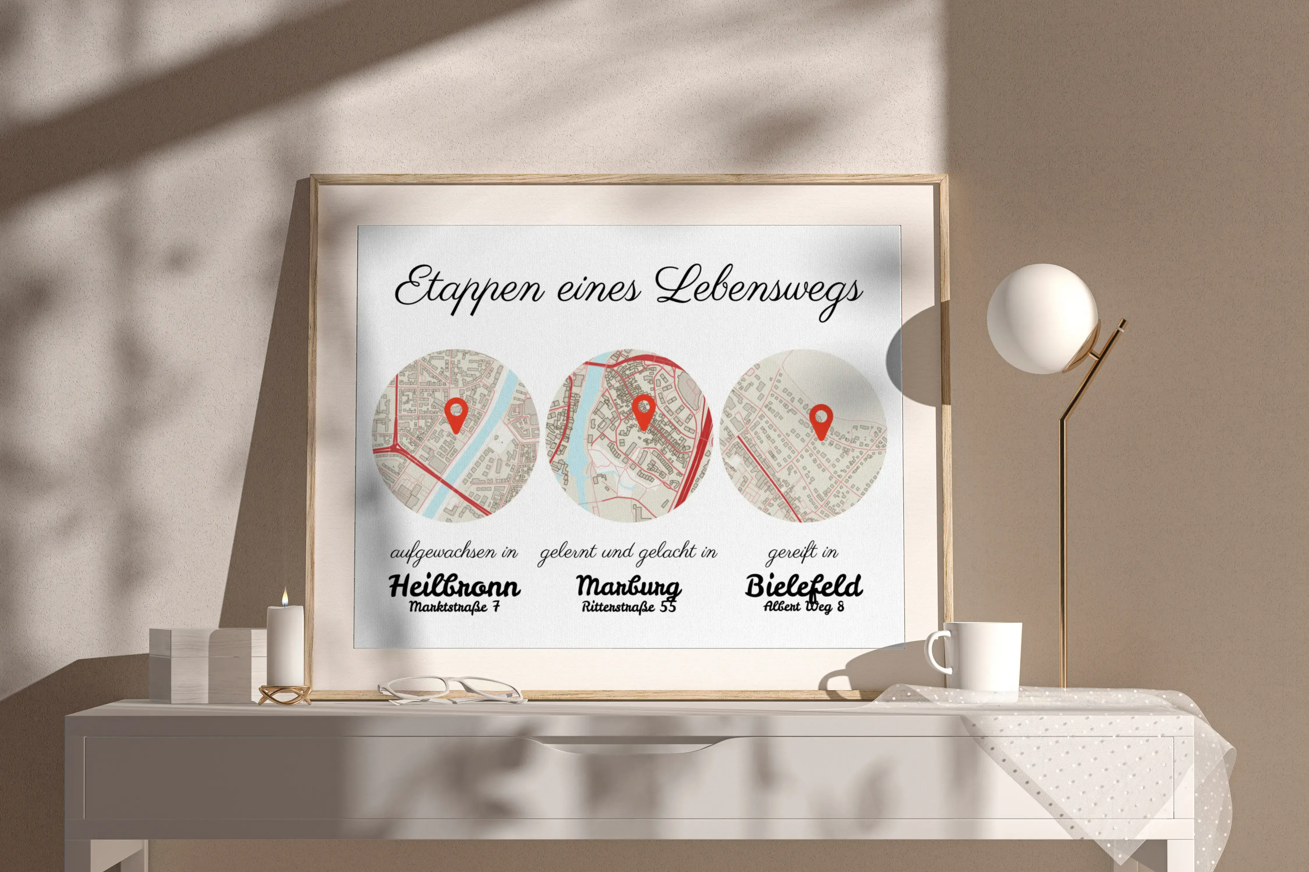 Starte jetzt mit der Erstellung deiner individuellen Lebensweg-Karte und verewige drei markante Lebensphasen: Deine Kindheit und Jugend, deine Ausbildungs- und Studienzeit sowie deine berufliche und persönliche Entwicklung.