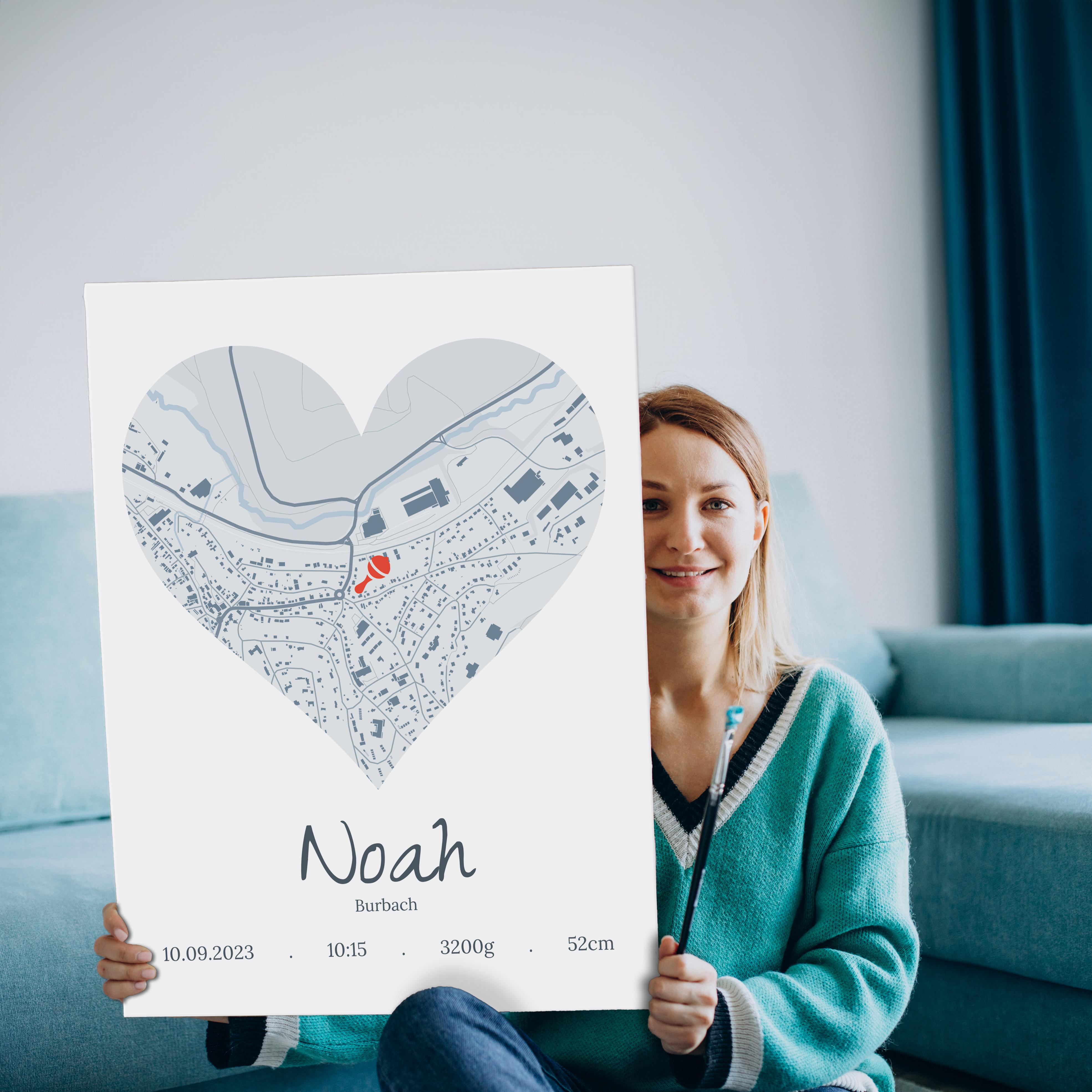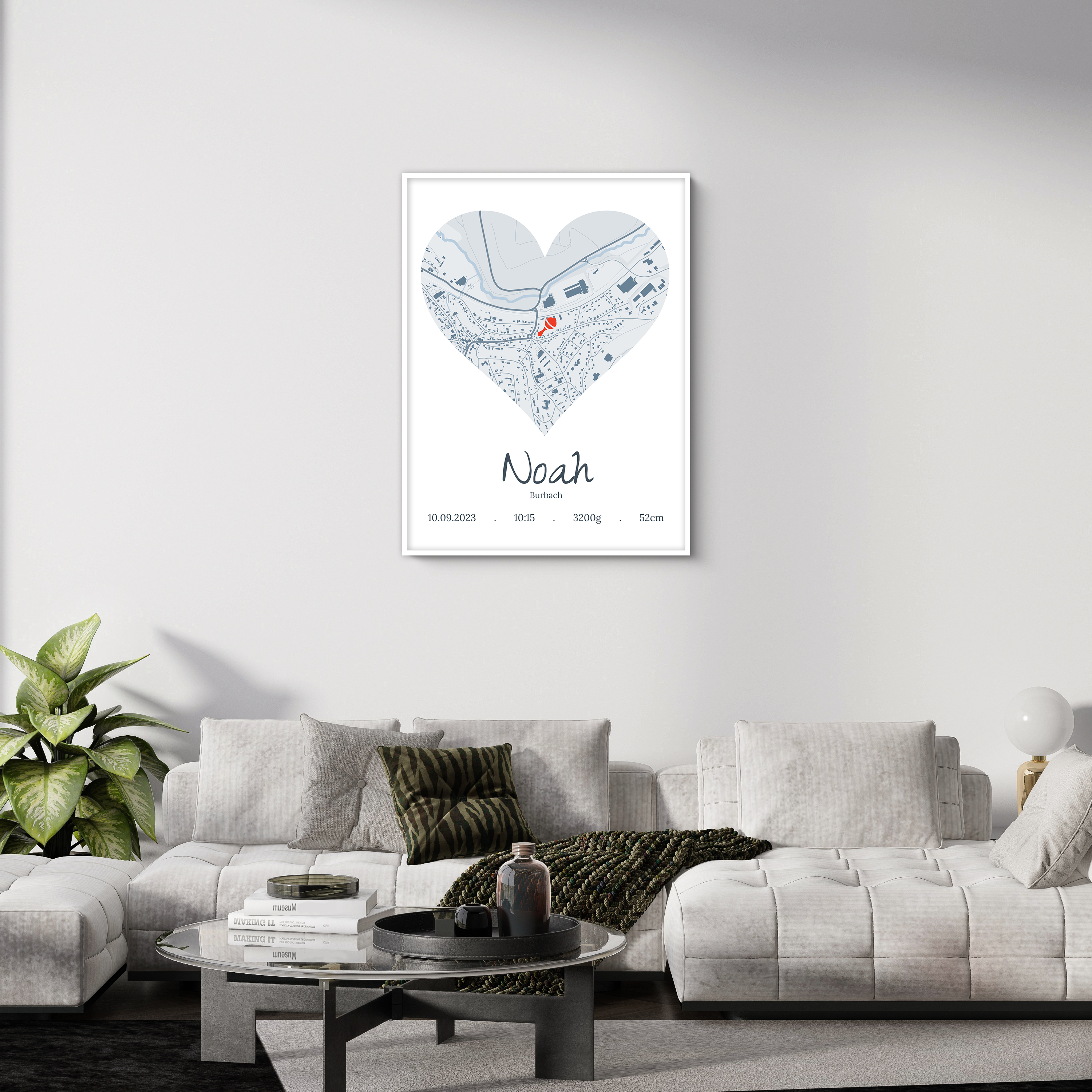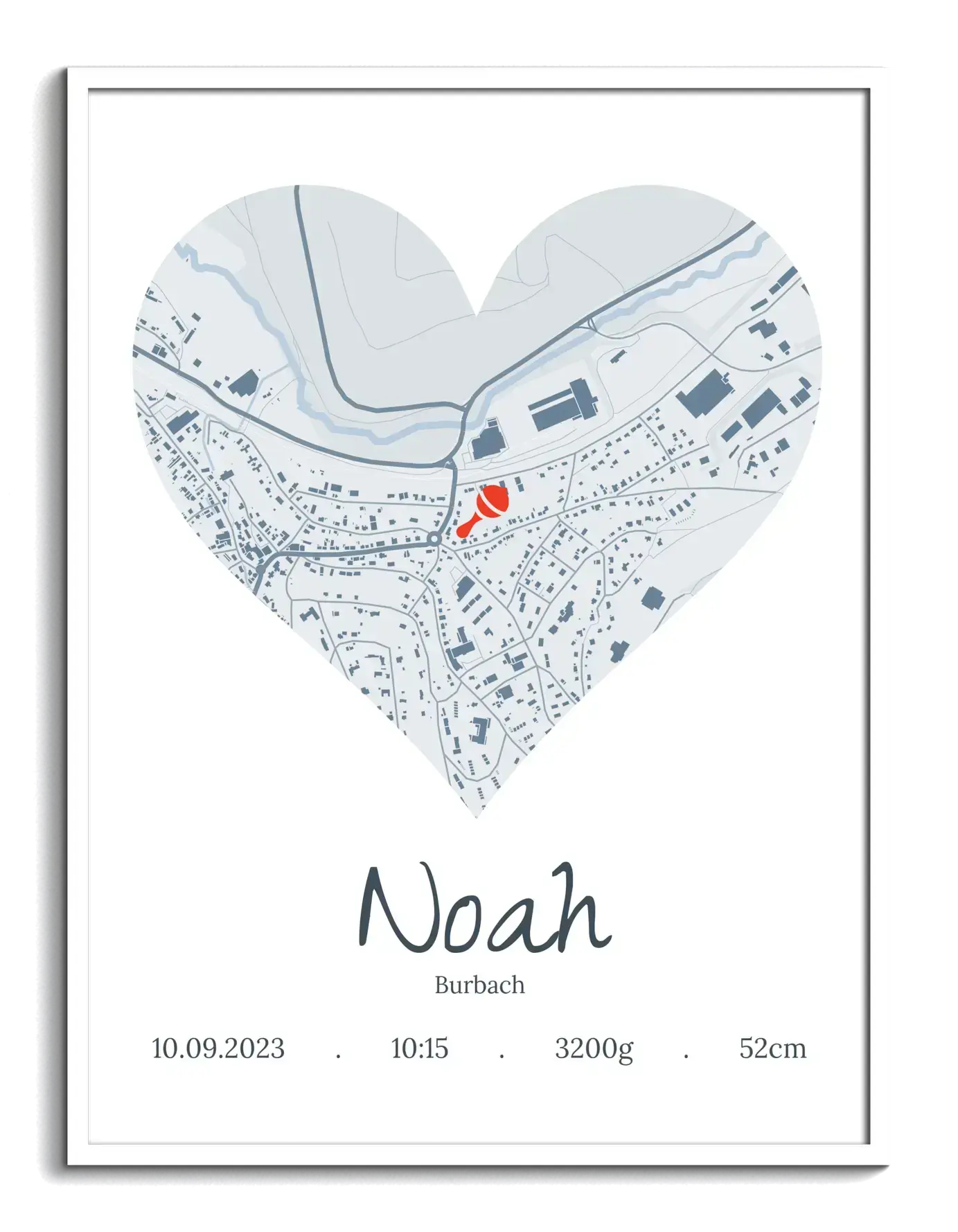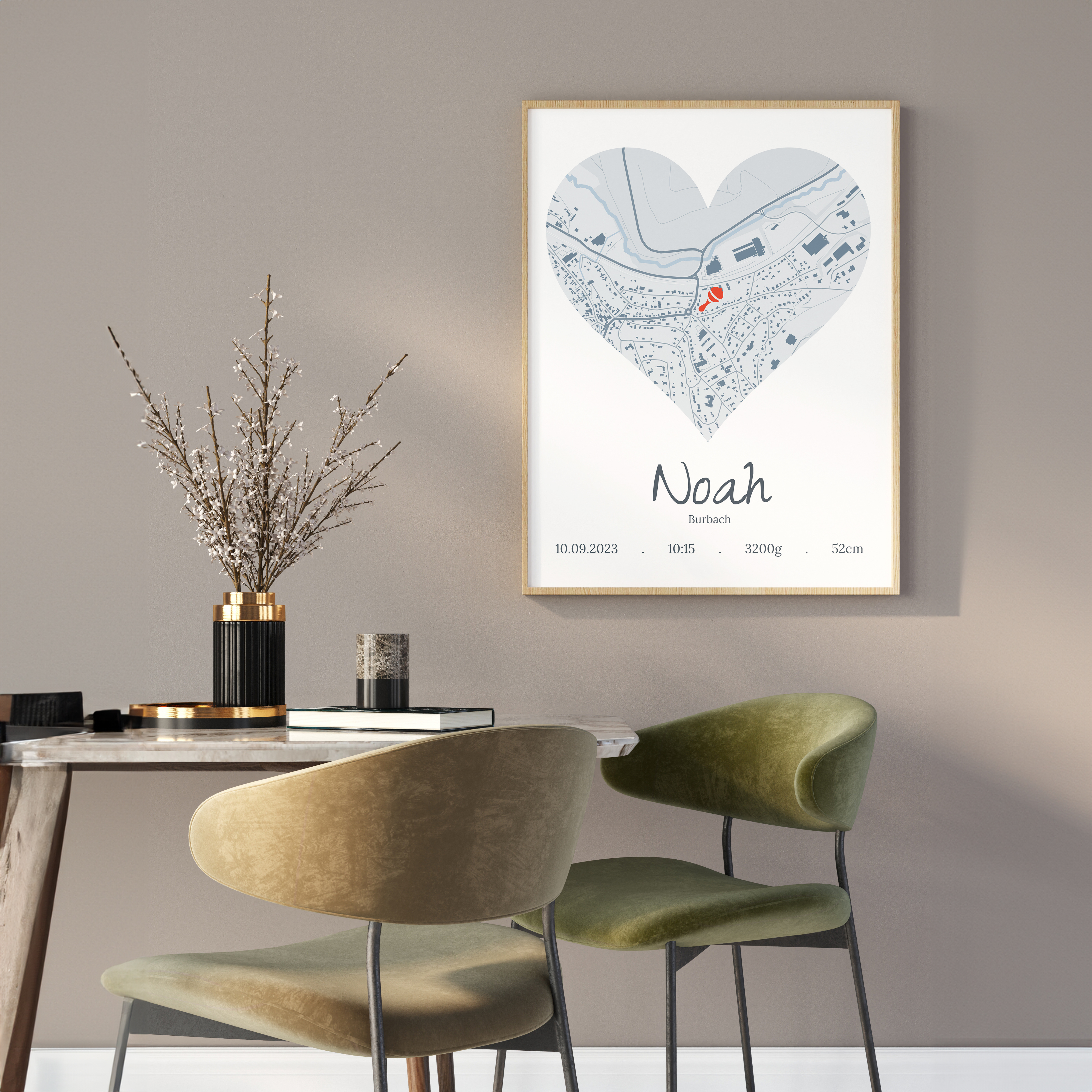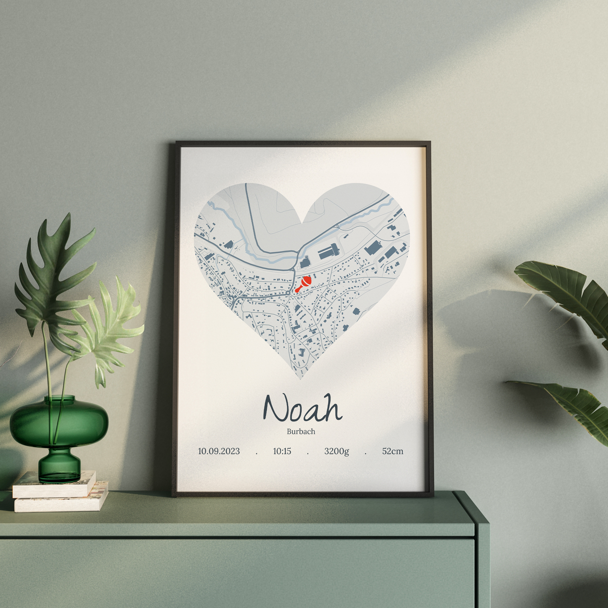 Geschenk zur Geburt: Posterdruck mit Stadtkarte, Koordinaten Namen, Ort, Gewicht und Grösse des Kindes. Druck als gerahmtes Poster oder JPG-Download.