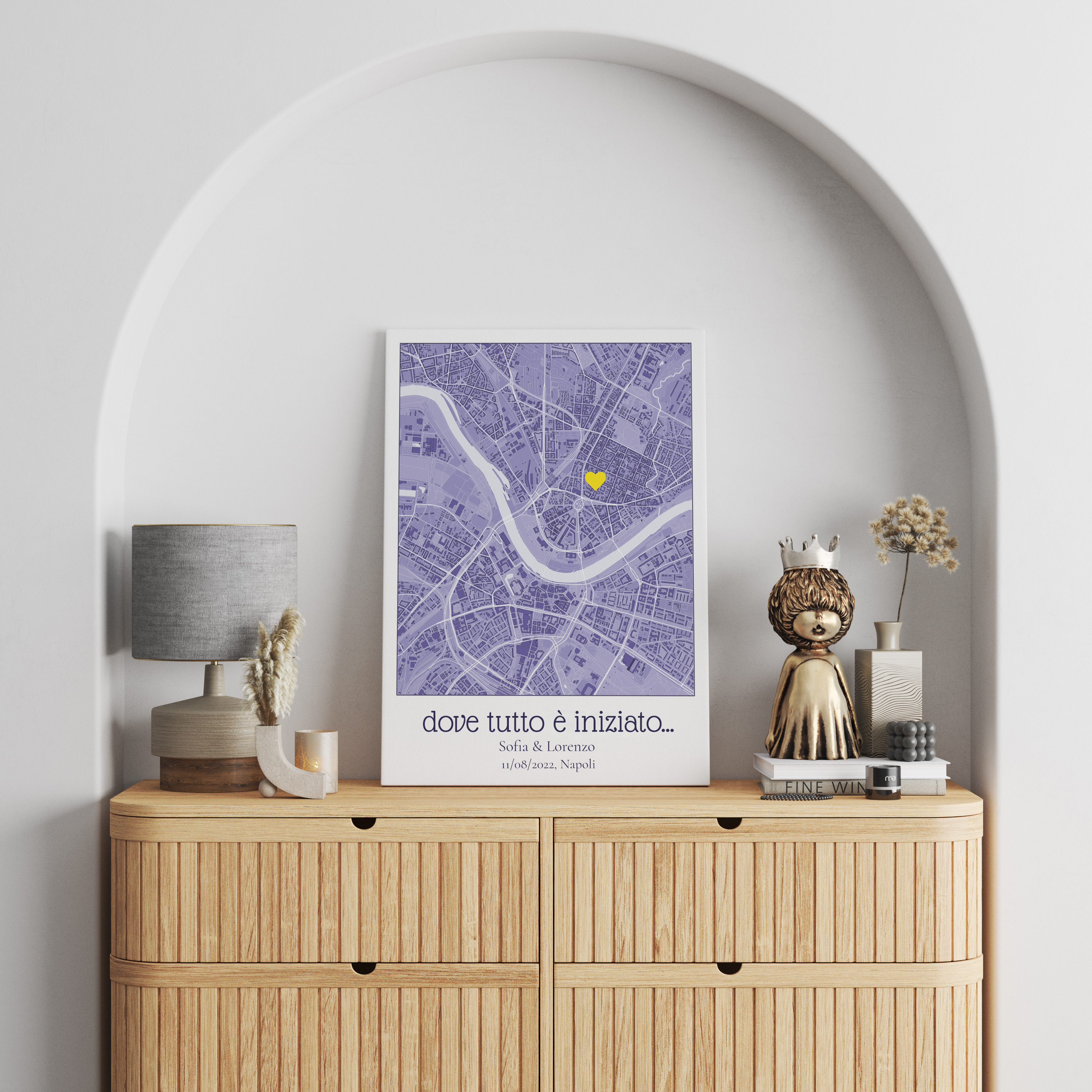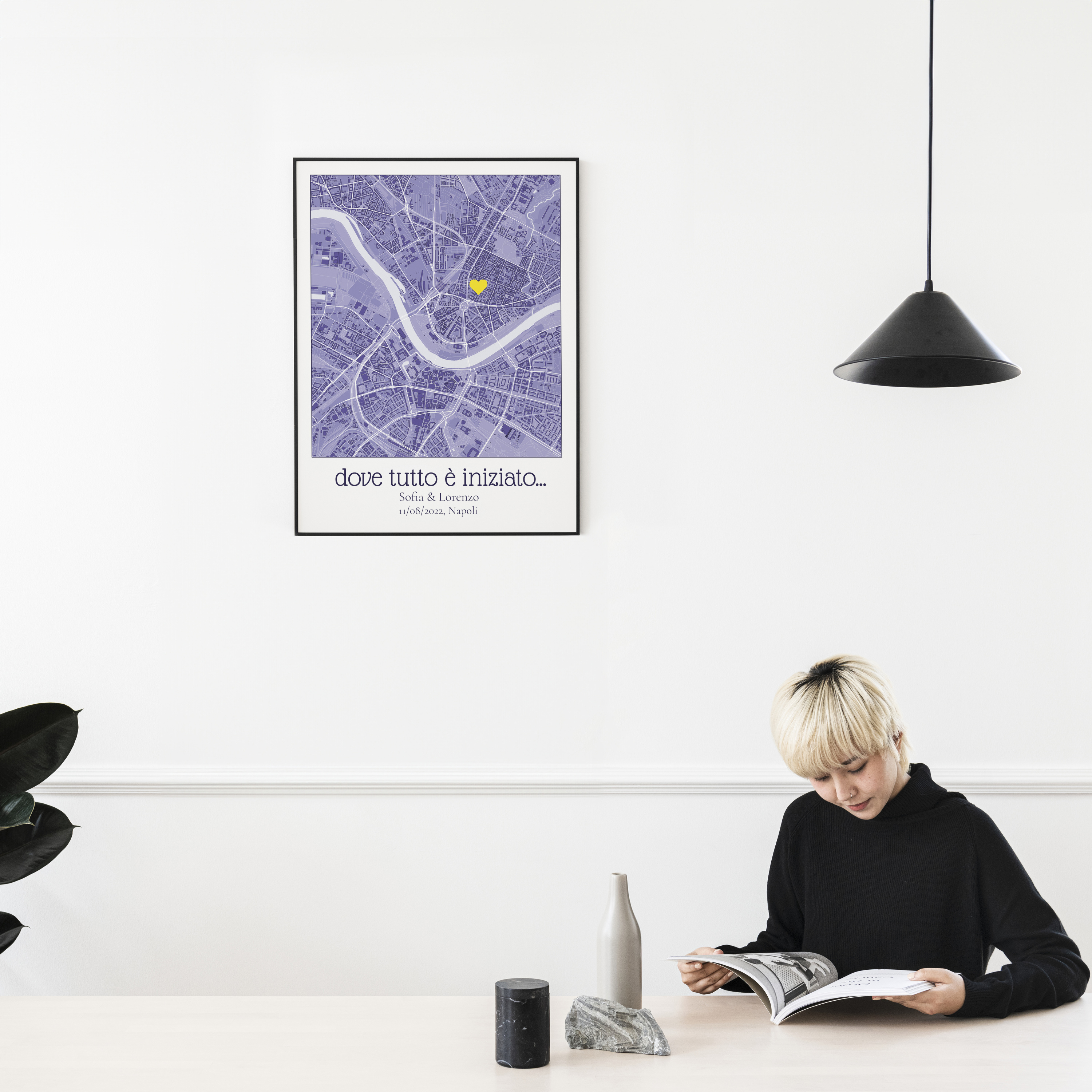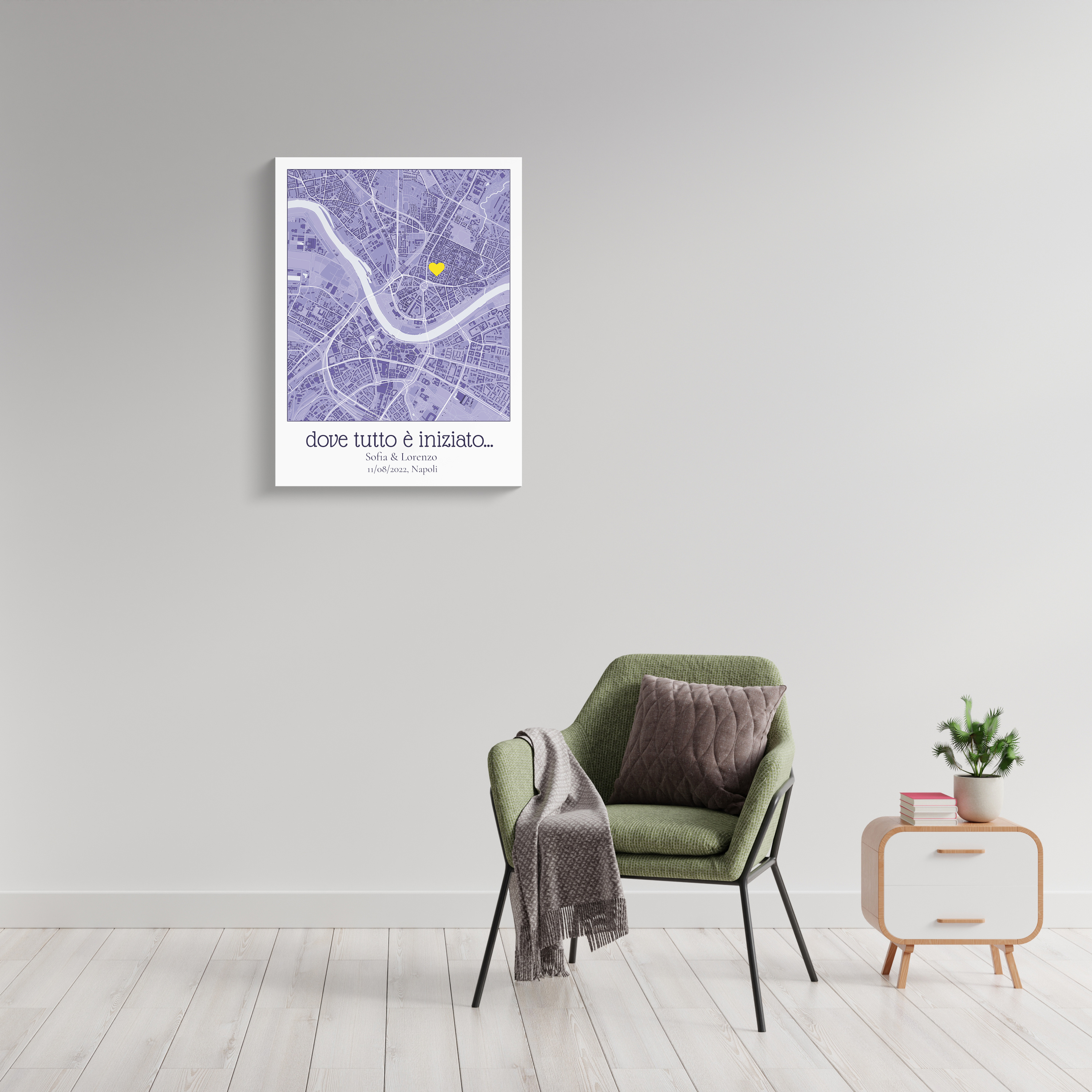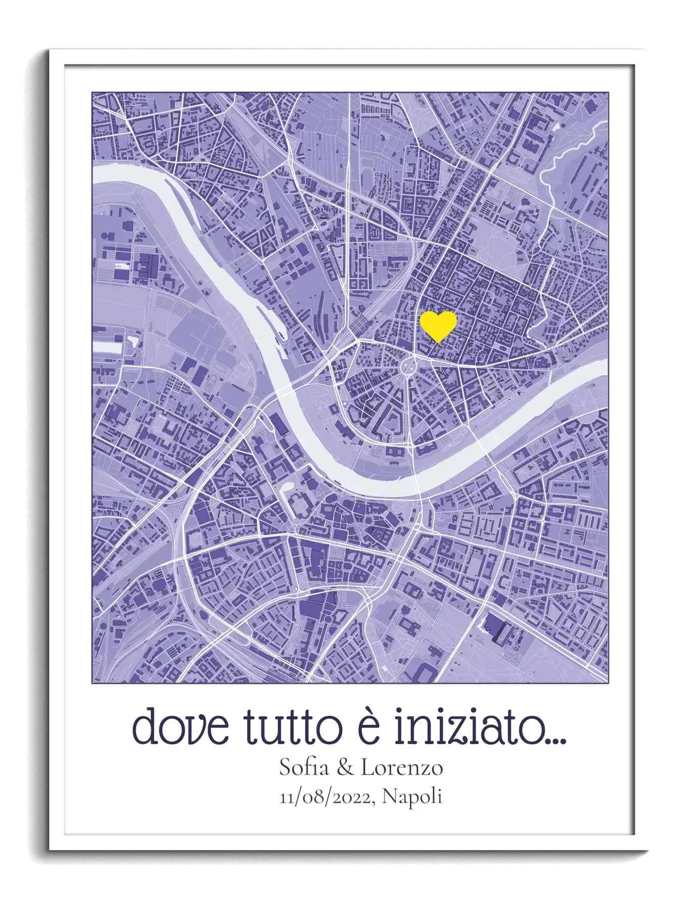 Creare la tua mappa personalizzata è semplice e flessibile. Basta inserire un indirizzo o un luogo, scegliere il design e lo stile, e aggiungere testi o simboli significativi. Puoi definire ogni dettaglio per assicurarti che la mappa rifletta davvero la tua storia.