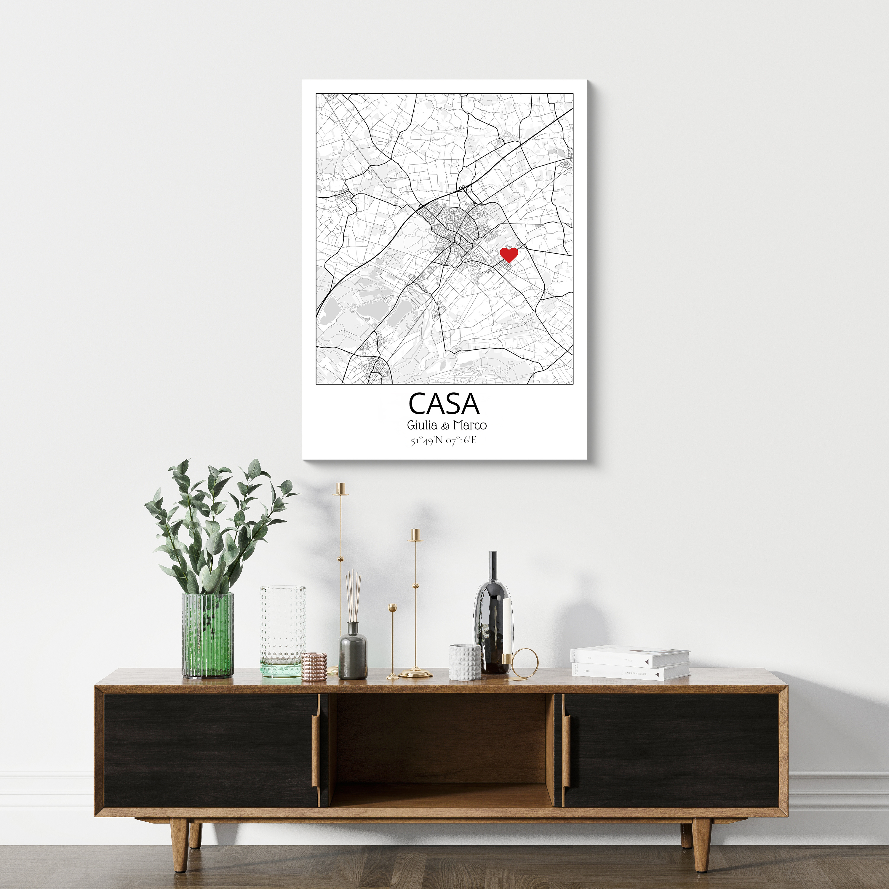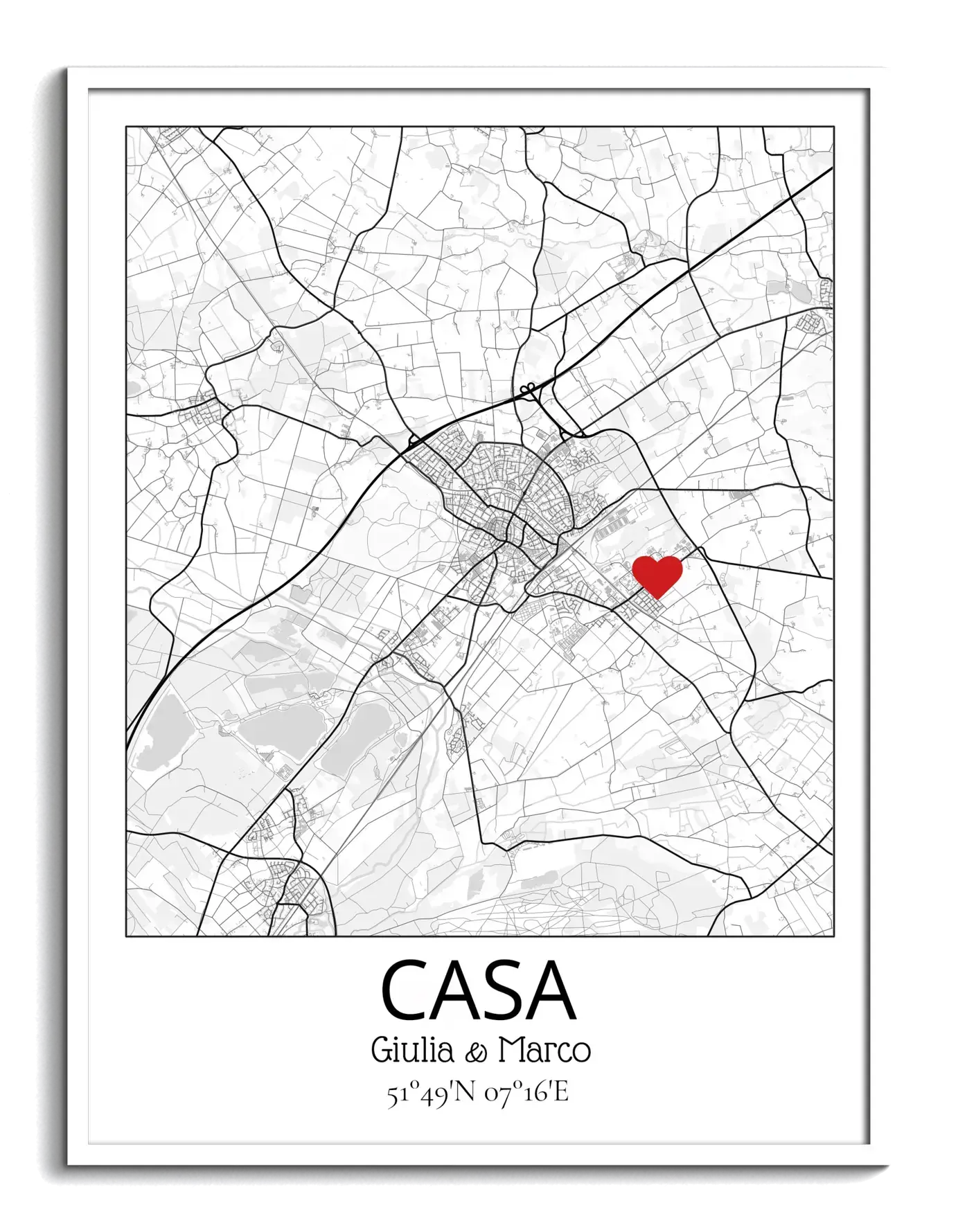 Un poster unico: casa evidenziata su mappa stilizzata con segnaposto personalizzabile.