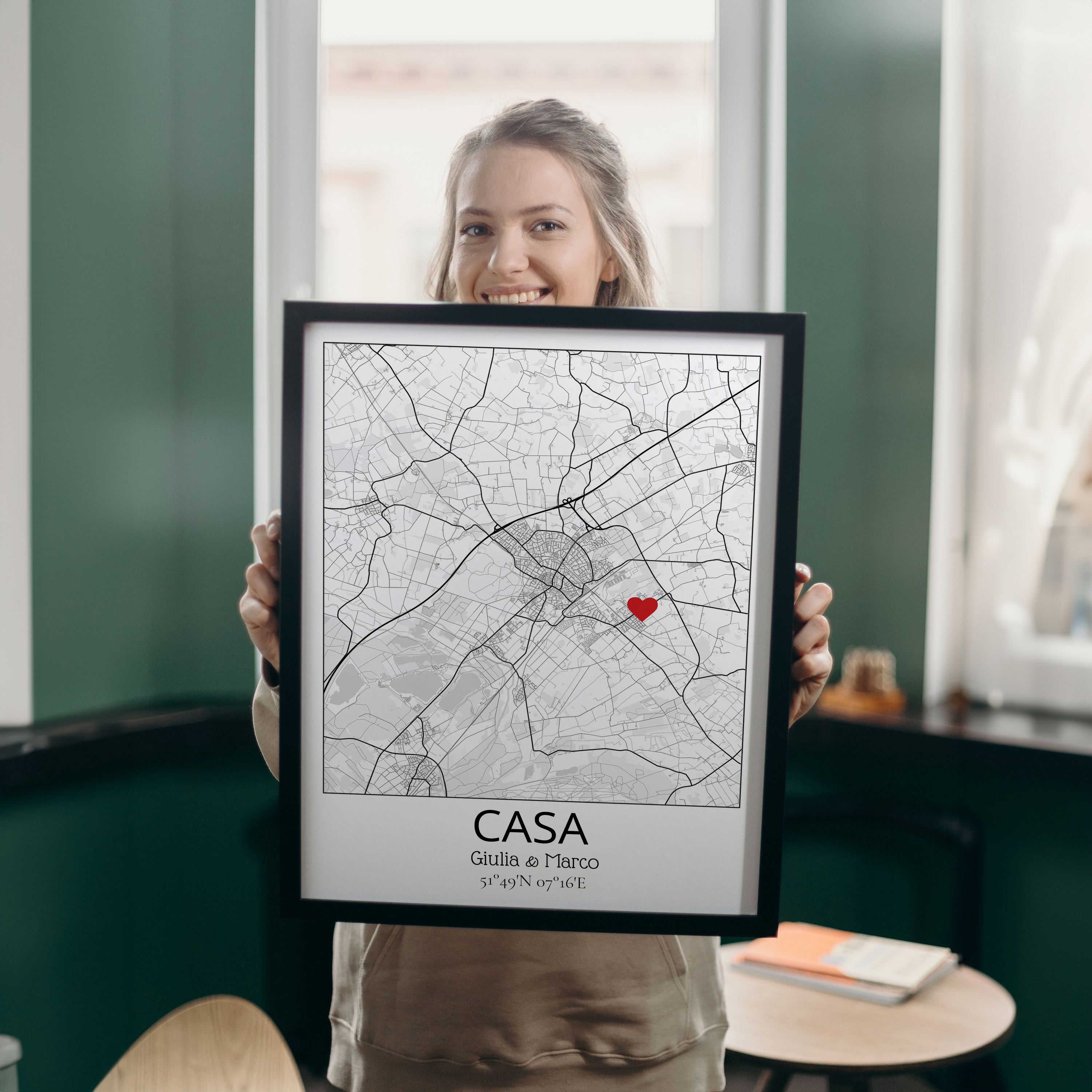 Creare una mappa personalizzata è semplice. Inserisci l'indirizzo desiderato, scegli il design e aggiungi un testo personalizzato se lo desideri. In pochi clic, avrai una rappresentazione visiva del tuo luogo speciale che potrai ammirare ogni giorno.